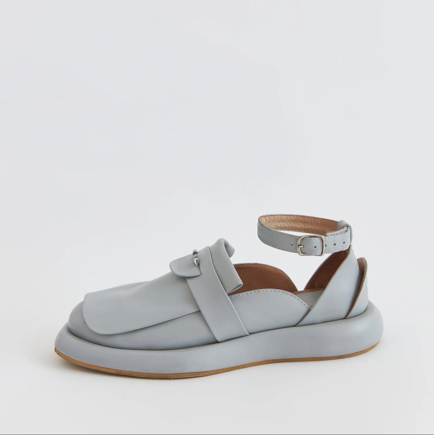 Embrace your courage and balance it with sky blue tenderness. Mariupol loafers has a signature bold character completed with ankle strap and half moon covered heel. Unique leaf decora0on provides authen0c style and fresh look without days off. Removable septum for those who don’t mind adding some spice